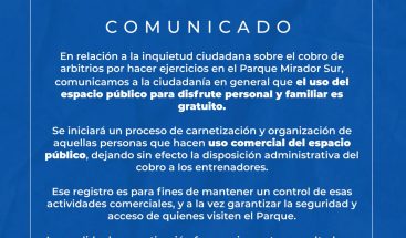 República Dominicana.-La Alcaldía del Distrito Nacional informó, la noche de este lunes, que dejó sin efecto el cobro a entrenadores deportivos y personales que utilizan las áreas del Parque Mirador Sur.