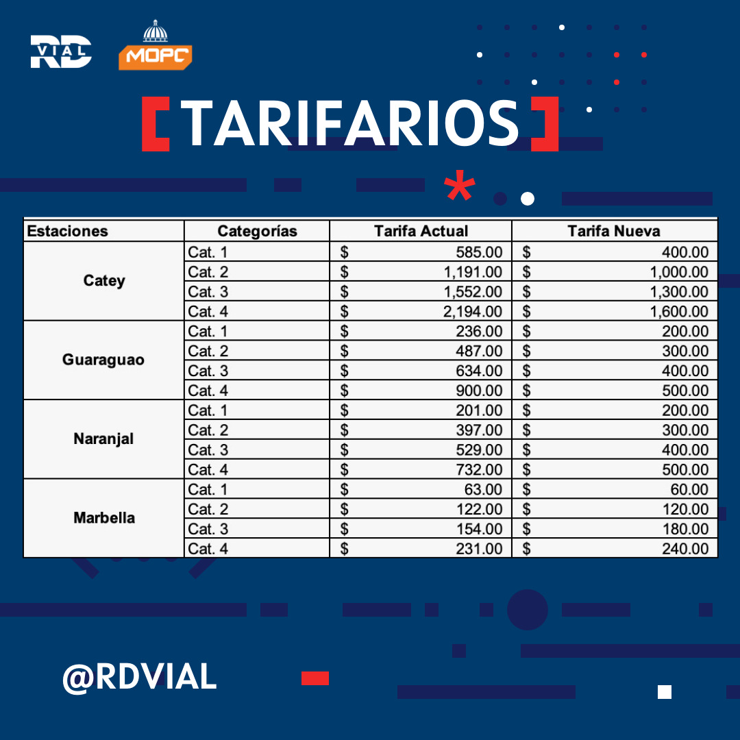 Las nuevas tarifas anunciadas para el peaje CATEY son: Los vehículos de categoría 1, pagarán RD $400.00 para una reducción de RD$185.00; categoría 2, RD$1,000.00, beneficiándose de una reducción de RD$191.00; los de categoría 3, RD$1,300.00, reduciéndoles RD$252.00; y los de categoría 4, RD$ 1,600.00, con una rebaja de RD$594.00.