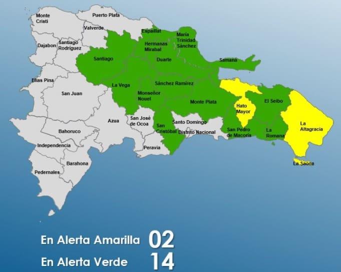 Las provincias en alerta amarilla son Hato Mayor y La Altagracia, por lo que tienen mayores probabilidades de crecidas de ríos y cañadas que generen inundaciones.