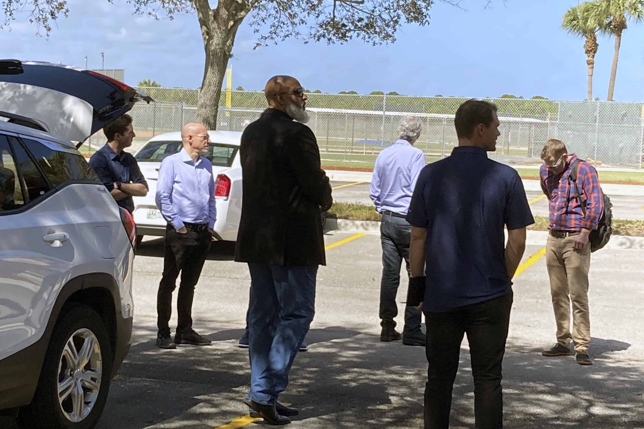 Clark y los jugadores se reunieron con Bruce Meyer, el jefe negociador del sindicato en el estacionamiento del lado del jardín derecho antes de ingresar al parque.