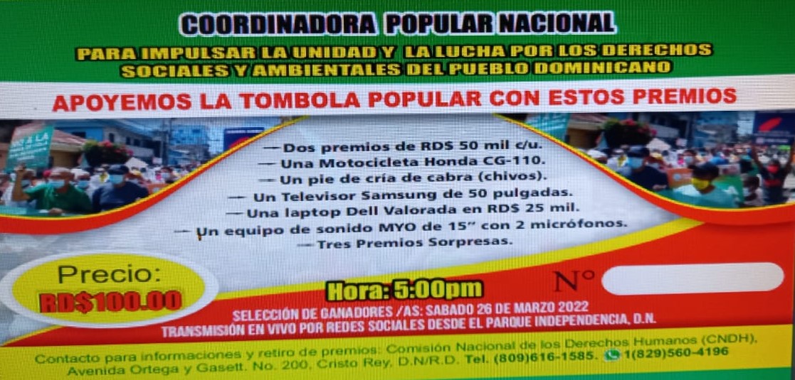 República Dominicana.-La Coordinadora Popular Nacional, en la que participan decenas de organizaciones nacionales, regionales y de base en la capital y en las provincias, lanzó una campaña para la recolección de fondos con la finalidad de apoyar las luchas sociales y los reclamos comunitarios que propician.