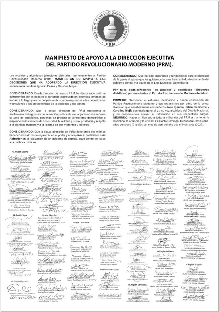En el manifiesto, los 113 directores distritales del PRM dan su apoyo a la continuidad de José Ignacio Paliza y Carolina Mejía en la Presidencia y secretaría General del partido, respectivamente.