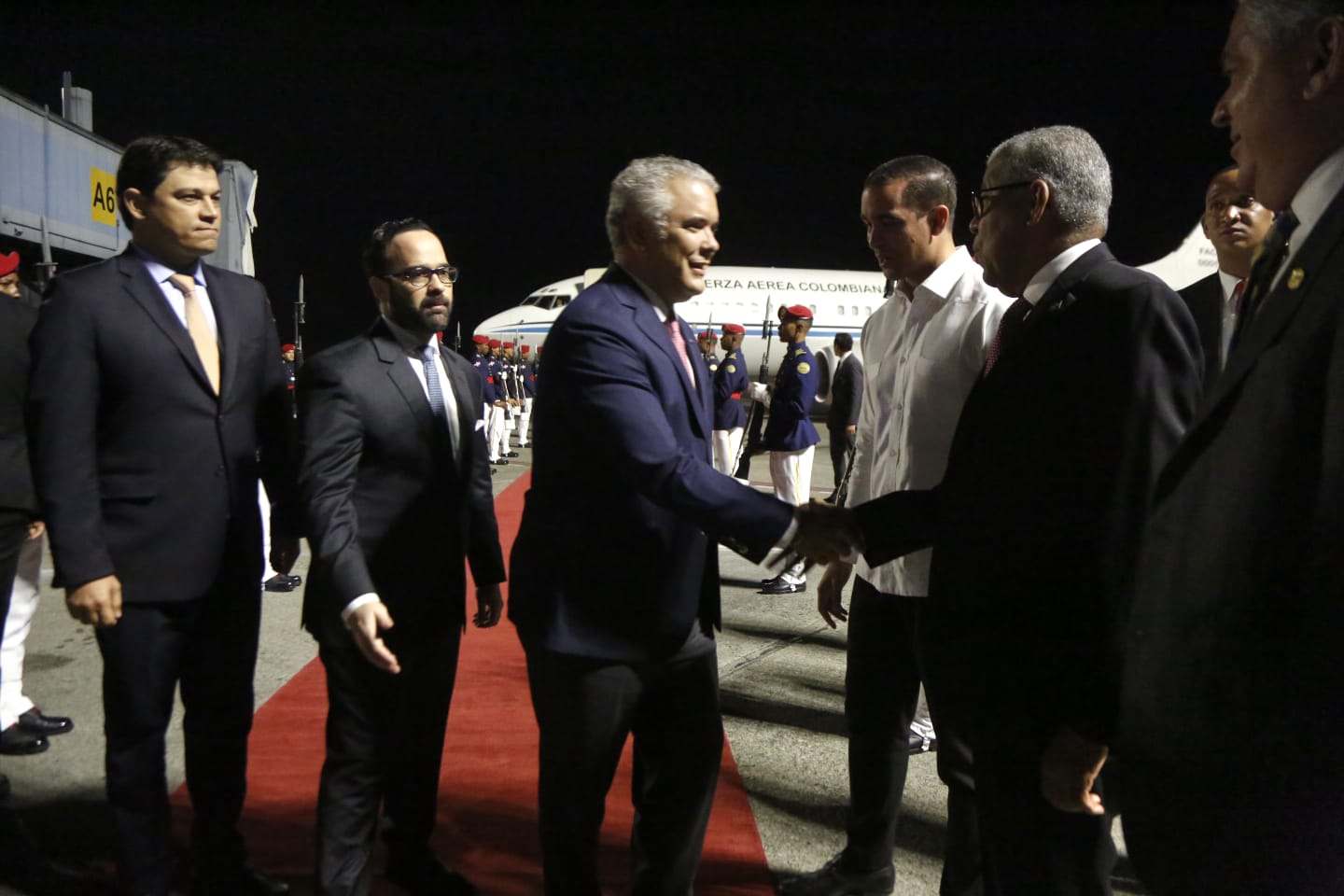 El presidente Duque y su comitiva oficial llegaron próximo a las 11:00 de la noche por el Aeropuerto Internacional Las Américas Dr. José Francisco Peña Gómez, donde fueron recibidos por los viceministros de Relaciones Exteriores, José Julio Gómez y Rubén Silié; el embajador de la República Dominicana en Colombia, Julio Cordero; el embajador, director de Ceremonial de Estado y Protocolo, Francisco Cantizano y el primer secretario, Hernán Iván Sánchez.