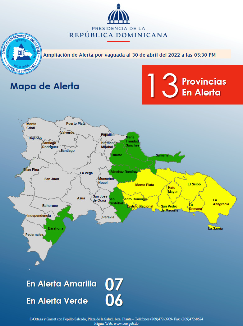 República Dominicana-En virtud de los establecido por la Oficina Nacional de Meteorología (ONAMET), en su informe de la tarde de este sábado, que establece que continuarán los aguaceros debido causa del acercamiento una vaguada ubicada al este de Puerto Rico, junto al transporte de humedad por parte del viento, el Centro de Operaciones de Emergencias (COE) aumentó a 7 el número de provincias en alerta amarilla y mantiene 6 en verde.