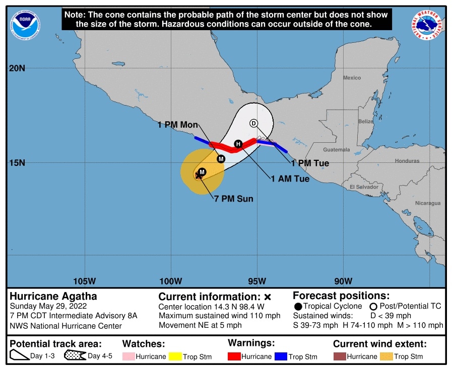 Según la trayectoria pronosticada, el centro de Agatha tocará tierra en el sur de México este lunes en tarde o principio de la noche.