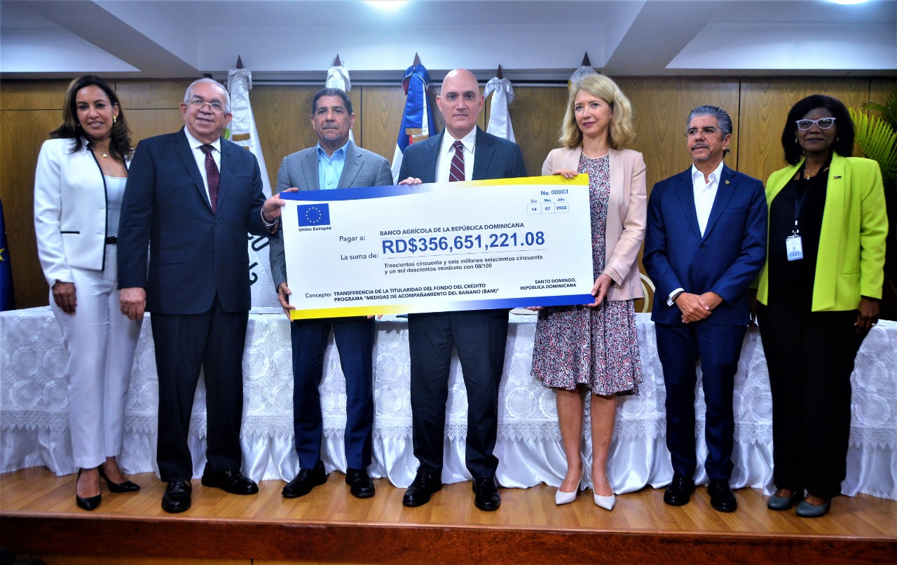 República Dominicana.-El Gobierno dominicano recibió de la Unión Europea la transferencia de fondos de la facilidad crediticia establecido en el programa "Medidas de Acompañamiento del Banano para República Dominicana” (BAM), por un monto de RD$322,261,284.02 millones, a ser ejecutado por el Banco Agrícola, en coordinación con los ministerios de Economía, Planificación y Desarrollo, y de Agricultura. Esta trasferencia será complementada por otros RD$34,389,937.06 para completar RD$356,651,221.08, monto total del aporte.