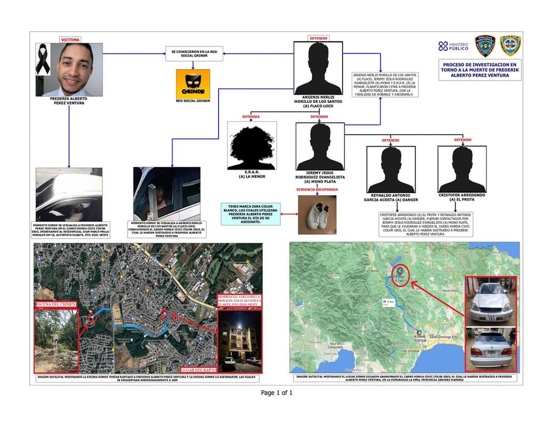 El grupo fue ubicado y apresado en atención a la orden de arresto 2022-TAUT-00620, luego de establecerse que Pérez Ventura fue contacto a través de redes sociales por Rodríguez Evangelista (Mono Plata) y Morillo de los Santos (El Rubito), quienes posteriormente junto a la citada menor perpetraron el crimen.
