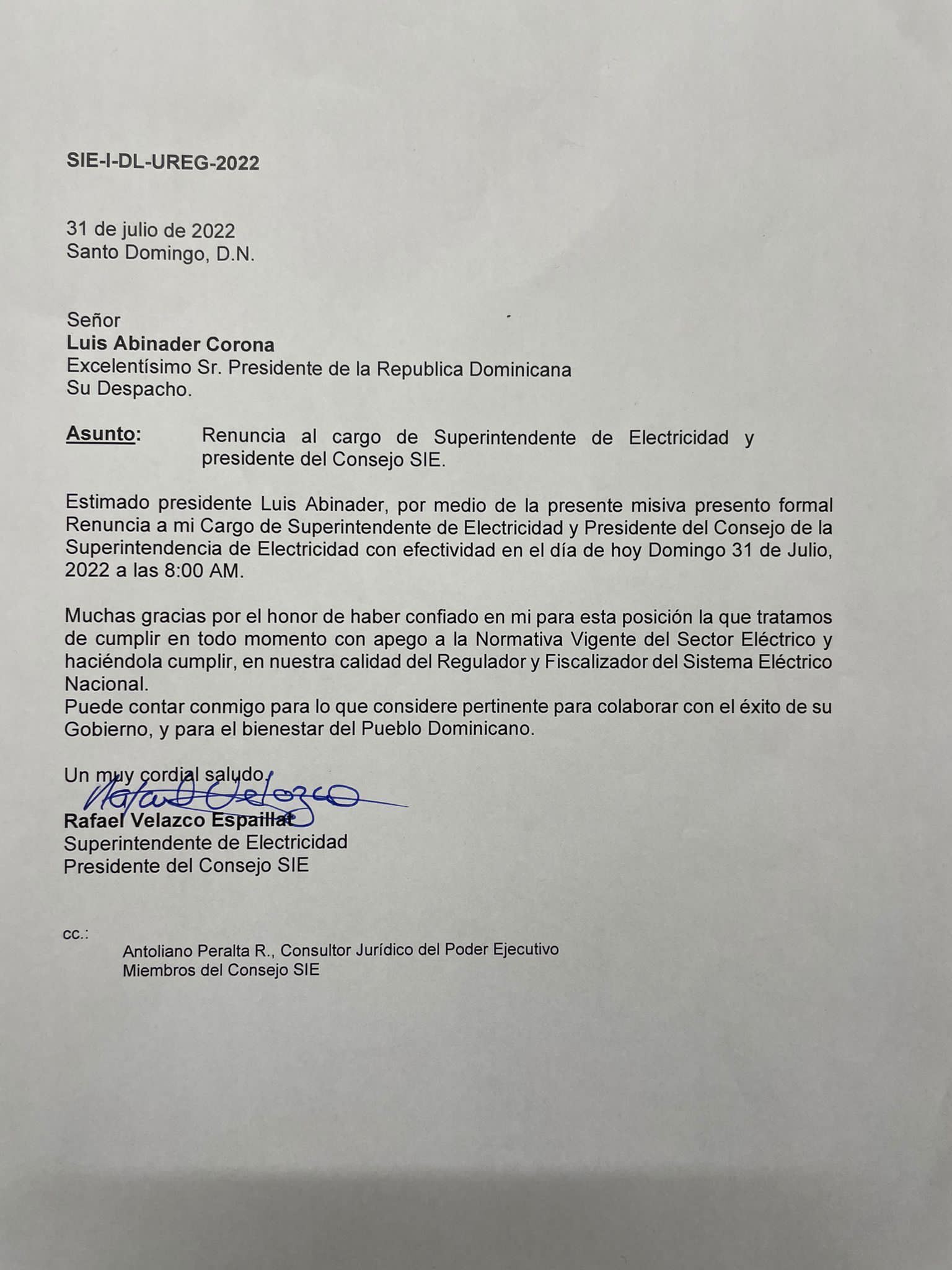 En su carta de renuncia el Superintendente de Electricidad y presidente del Consejo SIE, Rafael Velazco Espaillat, agradece al presidente el haberlo tomado en cuenta para un cargo publico y se reitera a su disposición. La critica mas fuerte que recibiera la gestión de Velazco Espaillat fue la de un incremento salarial que intentara justificar sobre la base de que no seria mas que una compensación por inflación.