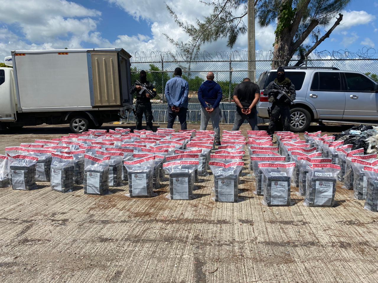 Al abordar la lancha se arrestaron a tres hombres (dos colombianos y un dominicano) y se incautaron 20 pacas conteniendo los 590 paquetes de una sustancia que presumimos es cocaína.