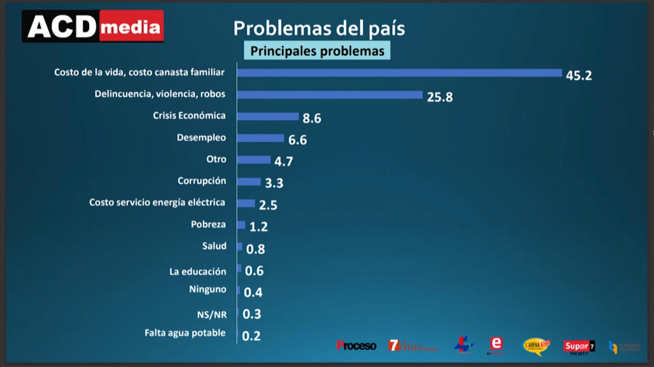 De acuerdo con los datos arrojados por la encuesta ACD Media en su primera entrega a pesar de lo debatido ampliamente en los medios y escenarios políticos del pais, la corrupción como preocupación de la población se ubica en un lejano sexto lugar en tanto que los altos precios de la canasta familiar, la inseguridad, la crisis económica y el desempleo, ocupan los primeros lugares como tema que angustian y tienen la mayor atención de los dominicanos.