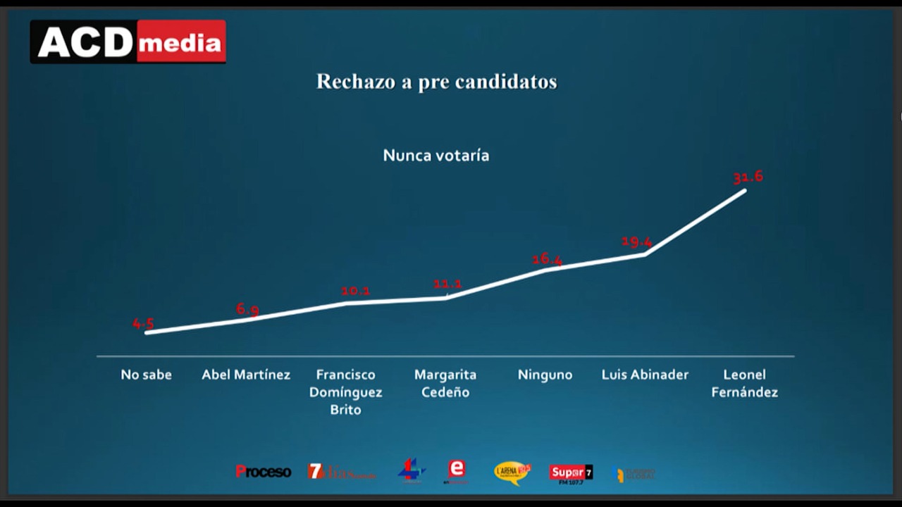 Santo Domingo, RD.- Un alto nivel de rechazo a figuras del liderazgo nacional muestra en sus resultados la Primera Encuesta Nacional de Opinión Publica patrocinada por la plataforma radial, televisiva y digital de mayor impacto en el país, ACD Media, cuyas mediciones ubican al doctor Leonel Fernández como el líder político de mayor rechazo ciudadano al recibir un 31.6% porcentual de los dominicanos al ser estos cuestionados sobre por quien nunca votaría en unas elecciones, quedando en segundo lugar Luis Abinader con 19.4%.