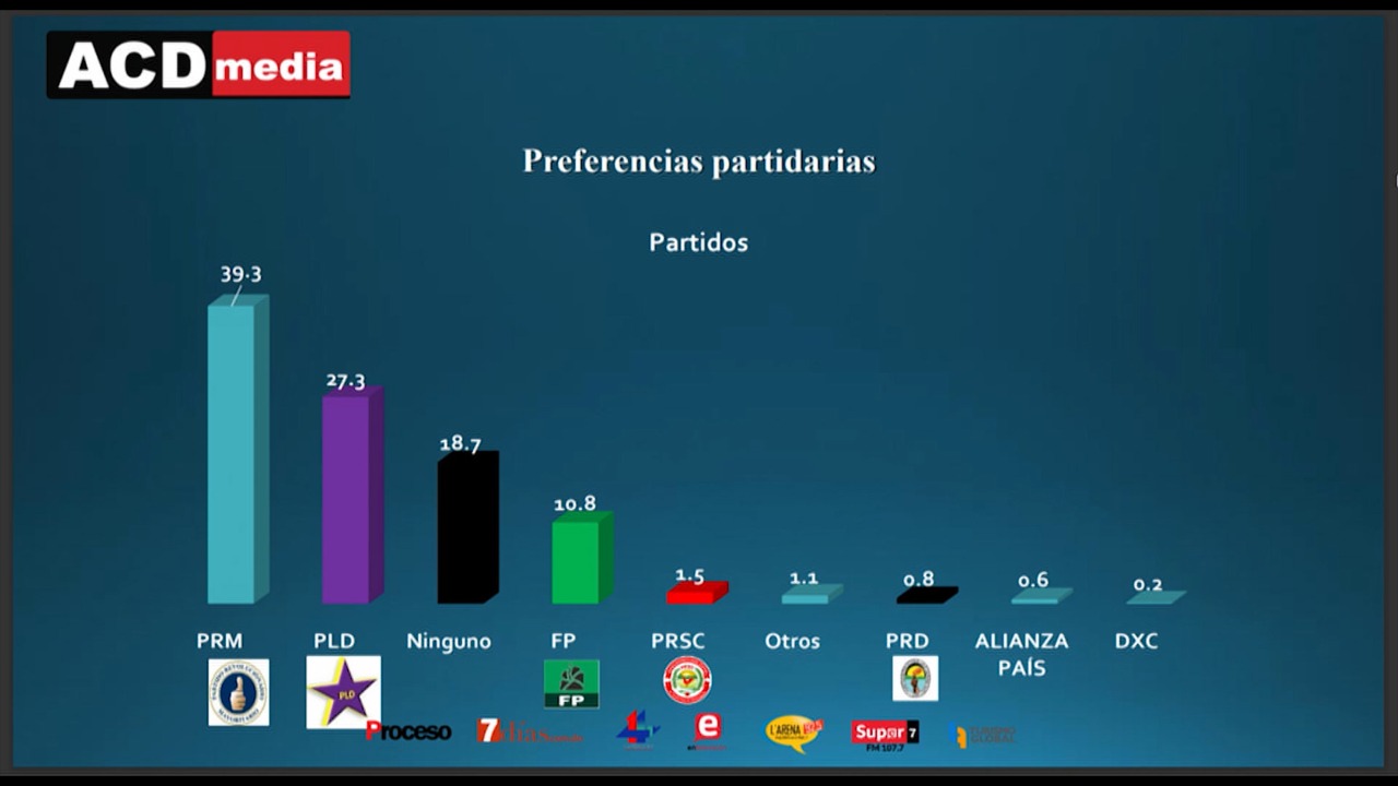 En el caso de los mayoritarios la encuesta refleja como preferencia revela que, en el orden de las preferencias partidaria de los dominicanos, en primer lugar se encuentra el Partido Revolucionario Moderno, PRM, con un 39.3% de simpatías, seguido por el Partido de la Liberación Dominicana, PLD, con un 27.3% de respaldo, Ninguno en un tercer lugar con un 18.7%, la Fuerza del Pueblo, FP.
