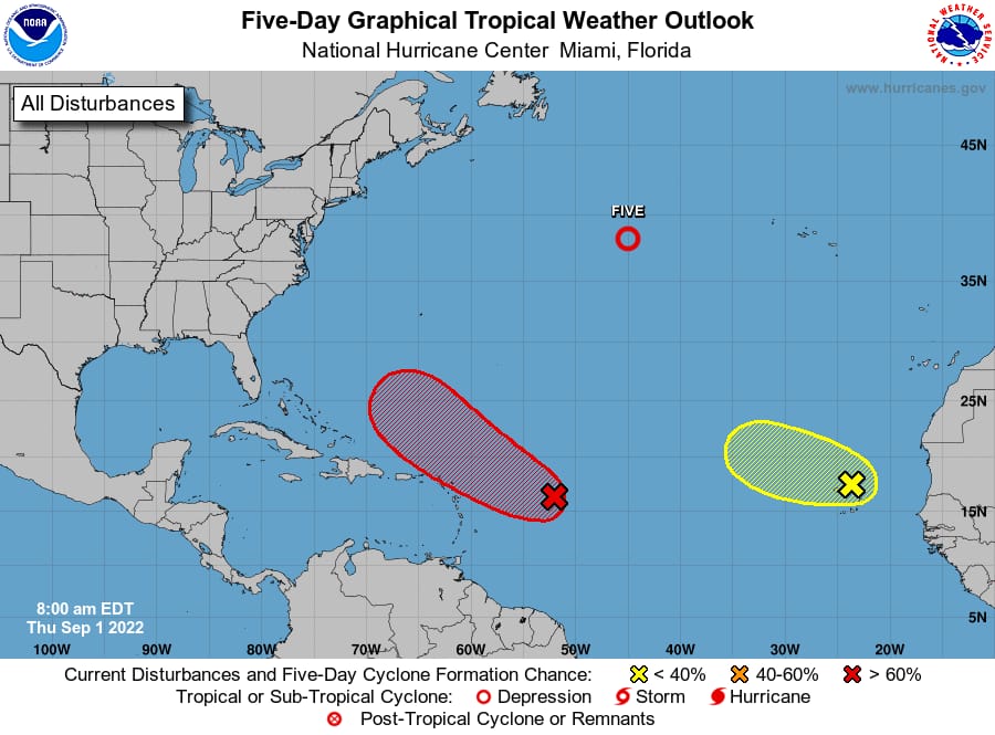 República Dominicana.-El Centro Nacional de Huracanes informó la formación en el Atlántico la depresión tropical número cinco de la temporada ciclónica.