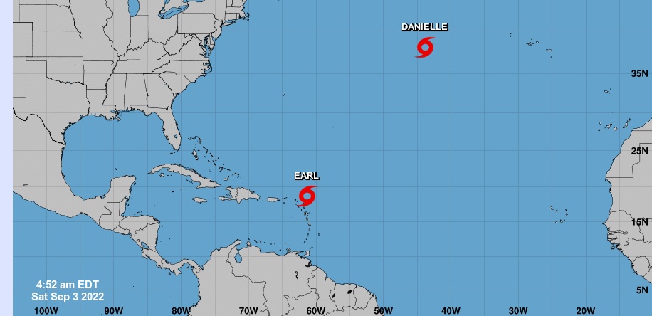 Earl debería pasar al norte de las islas Sotavento esta noche vientos máx. de 65 km/h Se espera total de lluvia de 2 a 4 pulgadas, con máximo de 6 Pulgadas. Con casi dos meses de sequía, el NHC vigila a dos ciclones tropicales ya nombrados en el Atlántico: el huracán Danielle, que se mueve sobre aguas abiertas en el centro-norte, y la tormenta tropical Earl al este de las Islas de Sotavento.