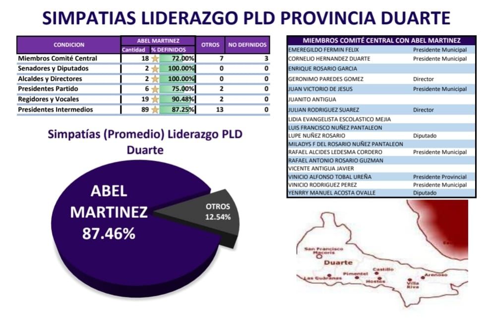 “Esta provincia Duarte decidió que el candidato que quieren ver representando al PLD en las elecciones presidenciales del 2024, es Abel Martínez, y una muestra fehaciente es que 25 miembros del Comité Central,18 están integrados en este equipo político, incluyendo los dos diputados; de 8 presidentes municipales, seis apoyan a Abel, así como los dos directores distritales”, detalló Núñez.