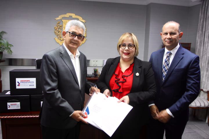 La entrega del proyecto de Ley Presupuesto General de la Nacion 2023, fue realizada por el director general de Presupuesto, José Rijo Presbot, junto al subdirector de Presupuesto, Iván Ramírez, entregaron el proyecto a Francisca Ivonny Mota, secretaria General Legislativa.