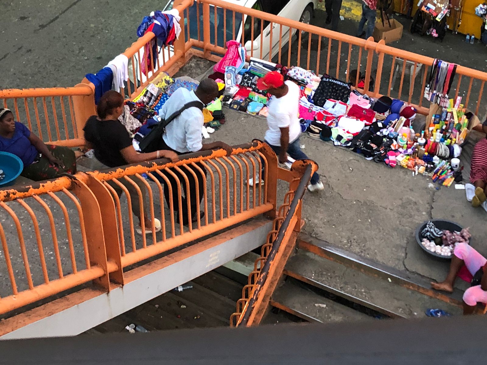 La hilera de tiendas móviles que tienen los haitianos sobre el puente peatonal del 9 de la Duarte no permite que los peatones puedan transitar con comodidad.