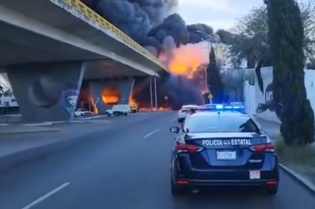 Una pipa de combustible fue impactada por un tren de carga en la ciudad de Aguascalientes, estado homónimo, provocando un fuerte incendio en la zona.