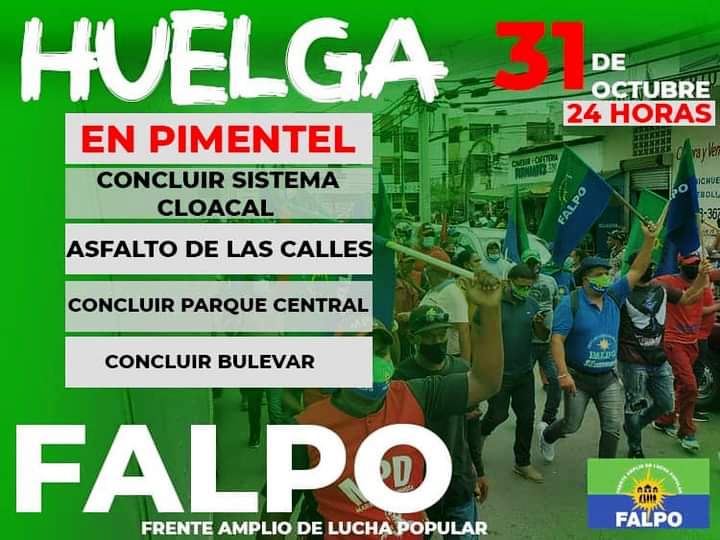 El Frente Amplio de Lucha Popular (FALPO), ratificó hoy el llamado a paro de actividades por 24 horas, para este lunes. 31 de octubre, en el municipio de Pimentel, por el incumplimiento de parte de las autoridades locales y del gobierno central, de reiteradas promesas de construcción de obras que por años han venido demandando en este municipio.