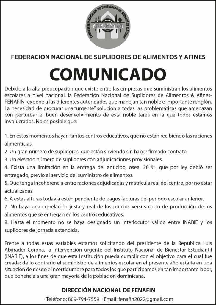 A través de un comunicado, FENAFIN denunció que en estos momentos hay muchos centros educativos que no están recibiendo las raciones alimenticias y además, que un gran número de suplidores están ofreciendo ese servicio sin haber firmado ningún contrato.