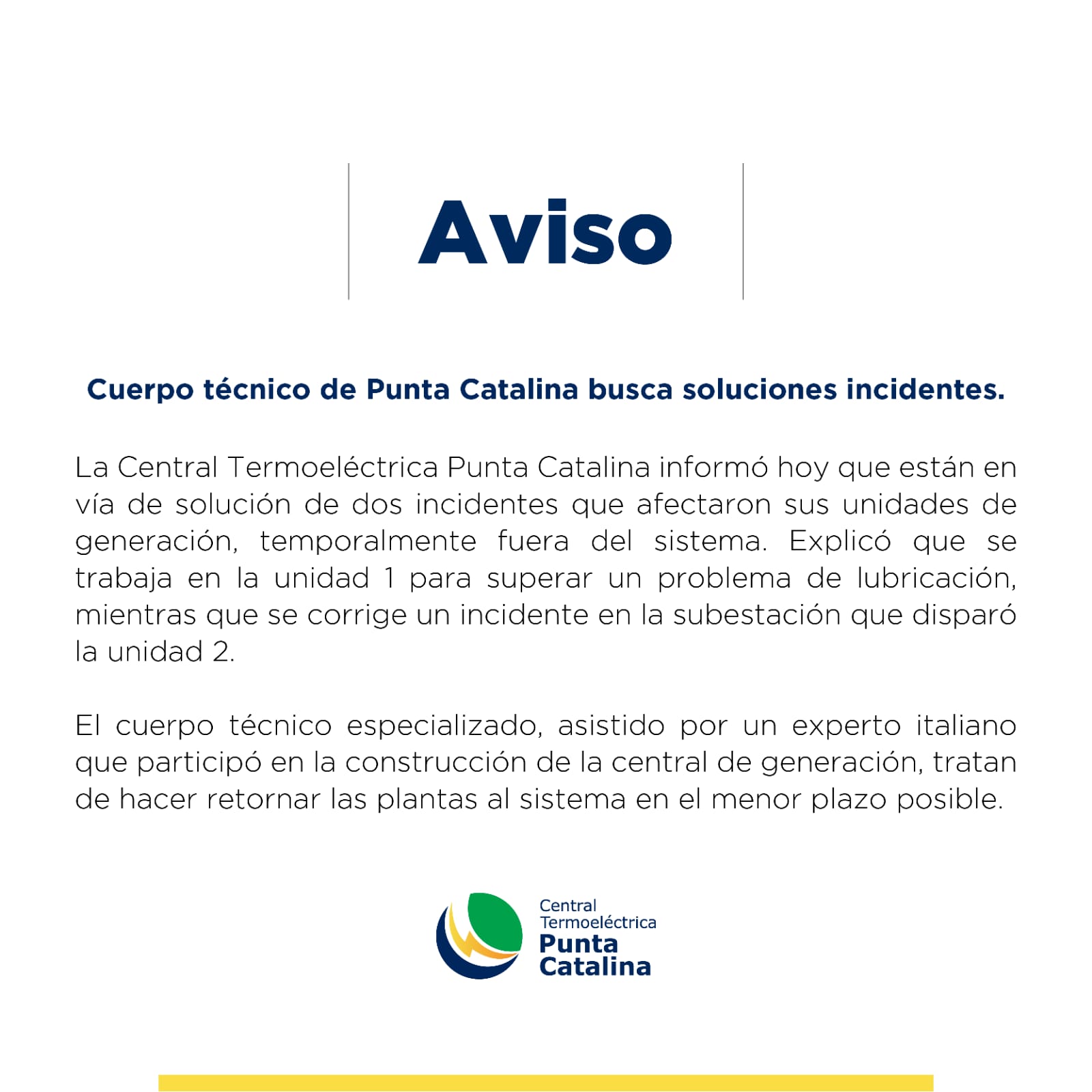 La Central Termoeléctrica Punta Catalina fue afectada por dos incidentes que dejaron fuera del sistema dos unidades de generación, sumándose esta situación a la salida de otras unidades térmicas que tampoco están generando, creando un mayor déficit en la ya deficiente generación eléctrica del pais.