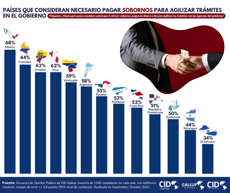 Cid Gallup publicó su estudio de opinión sobre los países que consideran necesario pagar sobornos para agilizar trámites en el gobierno, donde se encuentra al detalle la información y los porcentajes de personas que hacen dicha valoración sobre la corrupción para llevar a cabo tareas de cualquier tipo en entidades gubernamentales, en lo cual Dominicana alcanza un 51% en la percepción ciudadana.