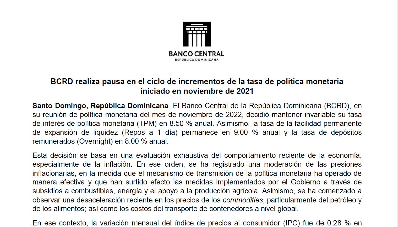 El Banco Central de la República Dominicana (BCRD), en su reunión de política monetaria del mes de noviembre de 2022, decidió mantener invariable su tasa de interés de política monetaria (TPM) en 8.50 % anual. Asimismo, la tasa de la facilidad permanente de expansión de liquidez (Repos a 1 día) permanece en 9.00 % anual y la tasa de depósitos remunerados (Overnight) en 8.00 % anual.