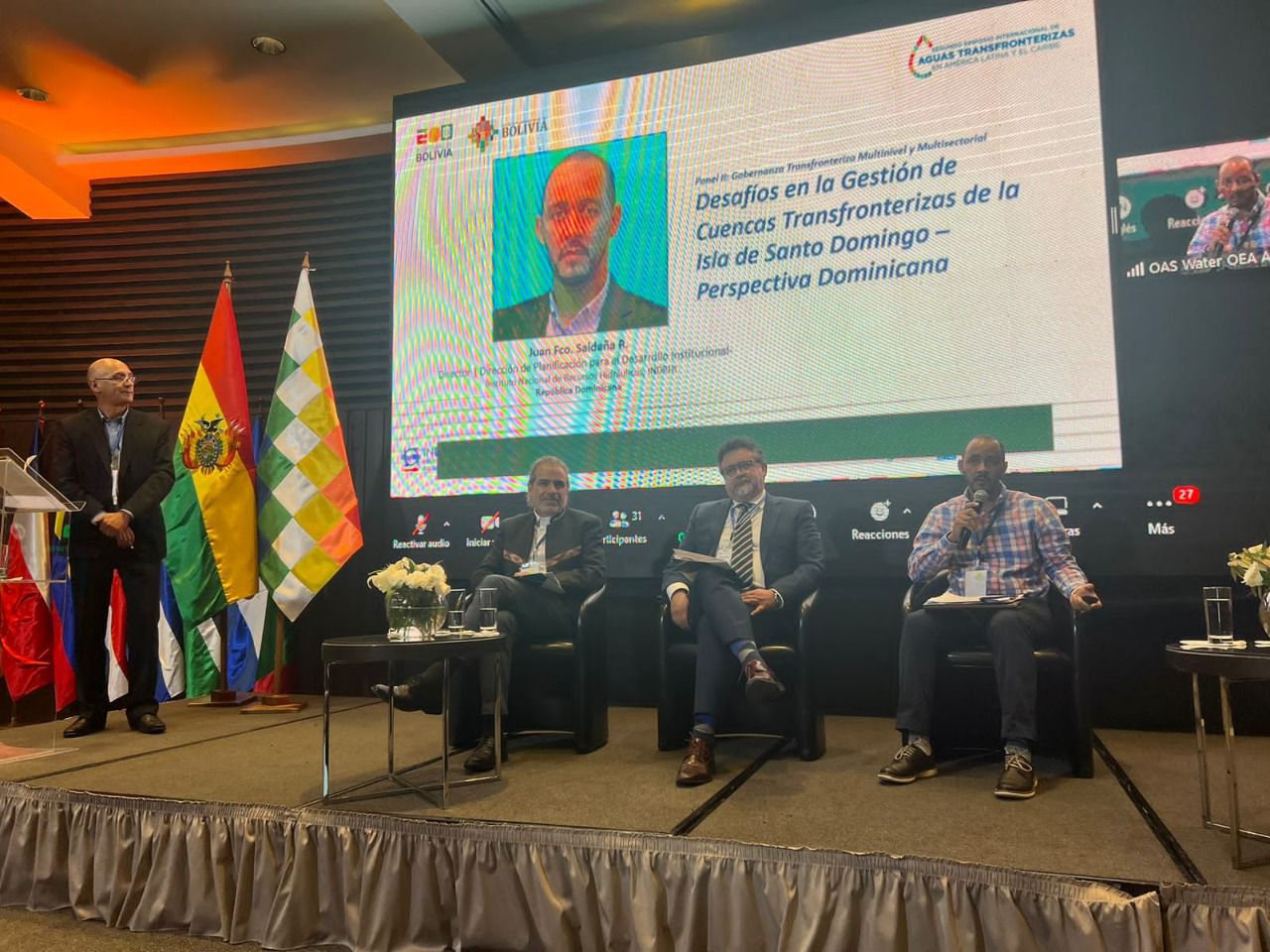 En representación de Olmedo Caba Romano, director ejecutivo del INDRHI, participó Juan Francisco Saldaña, director de Planificación para el Desarrollo Institucional, en dicha mesa de trabajo que se llevó a cabo en la nación suramericana en el marco del II Simposio Internacional de Aguas Transfronterizas en América Latina, con la participación de la Comisión Económica de las Naciones Unidas para Europa (CEPE), la Organización de Estados Americanos (OEA), el Banco Interamericano de Desarrollo (BID) y el Programa de las Naciones Unidas para el Medio Ambiente (PNUMA).