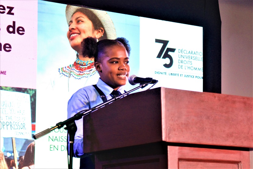 La Declaración Universal de los Derechos Humanos del 10 de diciembre de 1948 sentó las bases para que el respeto a la dignidad humana fuera reconocido por todos los pueblos del mundo. “Esta celebración es una oportunidad para que reflexionemos sobre los logros, las batallas libradas o los desafíos por cumplir en el marco de la promoción y defensa de los principios y valores que protegen a cada individuo”, recordó Chelsie Celissaint, Nueva Secundaria. Alumna número 4 de la Secundaria Nacional La Saline, quien se mostró encantada con la reapertura de su liceo.