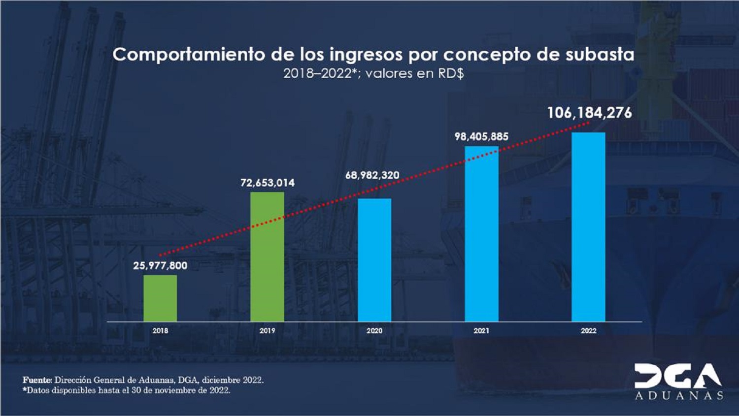 Santo Domingo. La Dirección General de Aduanas (DGA), recaudó RD$106,184,276.13, en las cinco subastas públicas que realizó, en el año 2022, de mercancías declaradas en abandono, procedentes de puertos y aeropuertos del país, luego de agotar el debido proceso jurídico.