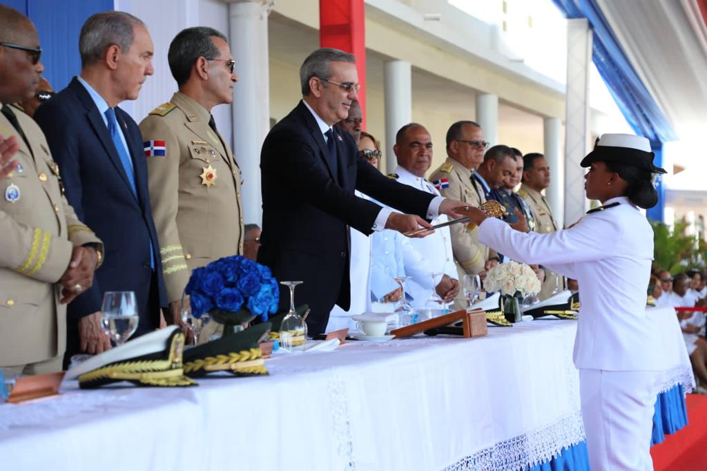 El mandatario tomó el juramento y entregó el sable de mando a los 31 nuevos oficiales subalternos graduados como licenciados en Ciencias Navales y Oficiales del Cuerpo de Comando, título reconocido por el sistema de educación superior del país a través del Ministerio de Educación Superior, Ciencia y Tecnología (MESCyT).