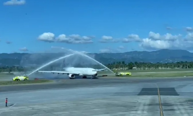 A la llegada del avión Airbus 330 fue recibido con un arco de bienvenida, banderas dominicanas y típicos bailes del Ballet Folklórico del Ministerio de Turismo, llenando de gran alegría a todos los pasajeros quienes además manifestaron su satisfacción de poder aterrizar directamente en Santiago.