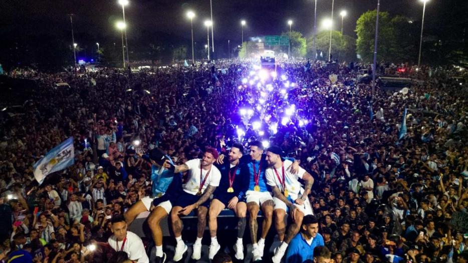 Tras pisar una cinematográfica alfombra roja, abordaron un autobús descapotable con imágenes de los jugadores, las tres estrellas que desde ahora llevará la camiseta albiceleste y el rótulo "Campeones del mundo", en el que empezaron a bailar y saltar al ritmo del éxito popularizado durante Qatar 2022 "Muchachos, nos volvimos a ilusionar", del grupo La Mosca Tse Tse, que les recibió en directo.