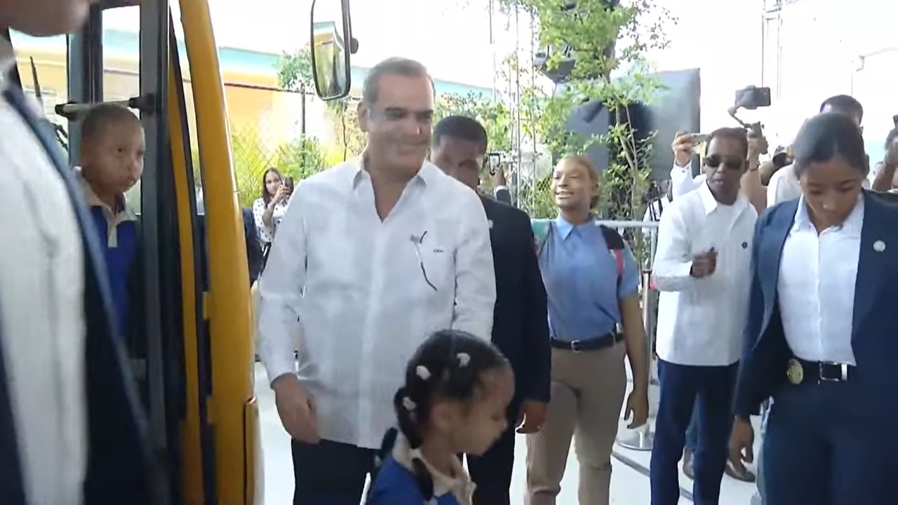 El presidente Luis Abinader llegó a bordo de uno de los autobuses del sistema de movilidad escolar, a la Escuela María Figueroa Adón, inaugurada hoy y desde allí resaltó que la iniciativa representa un espaldarazo a las familias de escasos recursos, que se les hace difícil asumir el costo que implica la movilidad de sus hijos a los centros educativos.