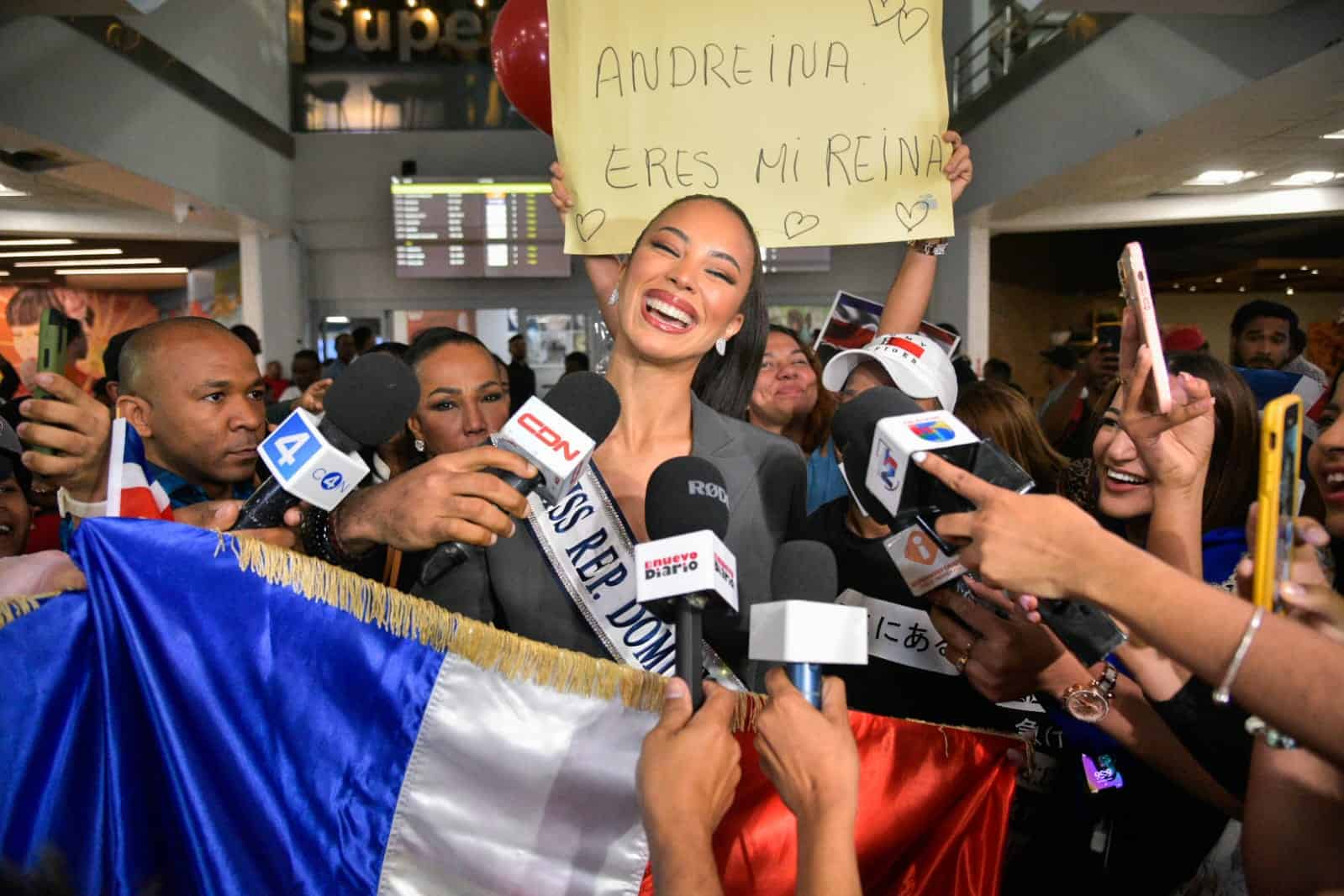 Andreína Martínez, cuyo aterrizaje estaba pautado para las 6:10 de la tarde, llegó sonriente y agradecida junto a la directora de la franquicia en RD, Magali Febles, y la multitud le impedía desplazarse con facilidad.