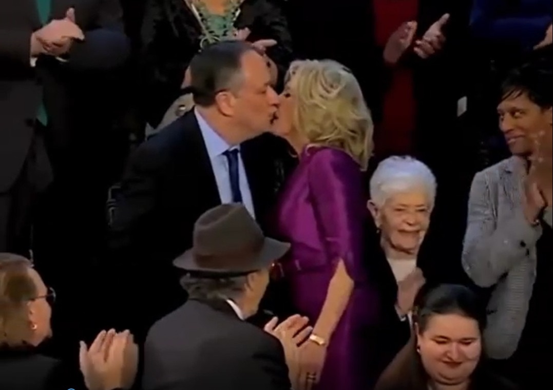 WASHINGTON.- Fotografos captaron el momento cuando la primera dama y el esposo de la vicepresidenta de los Estados Unidos se han encontrado en la tribuna principal del Congreso y se han saludado con un beso que ha sorprendido a todos y cuyo video circula profusamente en las redes sociales.