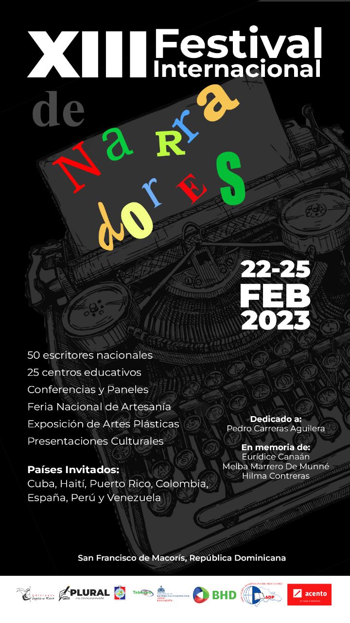 DUARTE.- Se Desarrollará en San Francisco de Macorís el XIII Festival Internacional de Narradores, del 22 al 25 de febrero, que contará con la participación de diversos países y estará dedicado a Pedro Carrera Aguilera, en memoria de; Eurídice Caanán, Melba Marrero de Munne e Hilma Contreras, contará además con actividades artísticas, lectura en movimiento entre otras.