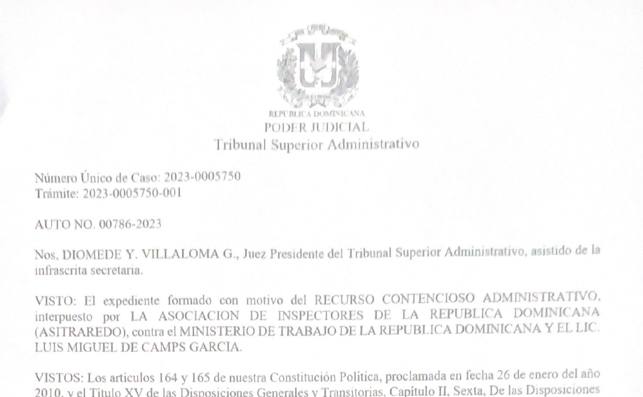 El TSA emitió el auto No. 00786-2023, de fecha 18 de enero, con el cual se informa a las partes para que entreguen su escrito de defensa, tanto al demandado ente jurídico Ministerio de Trabajo, como al ministro Luis Miguel de Camps García, acusado como persona física.