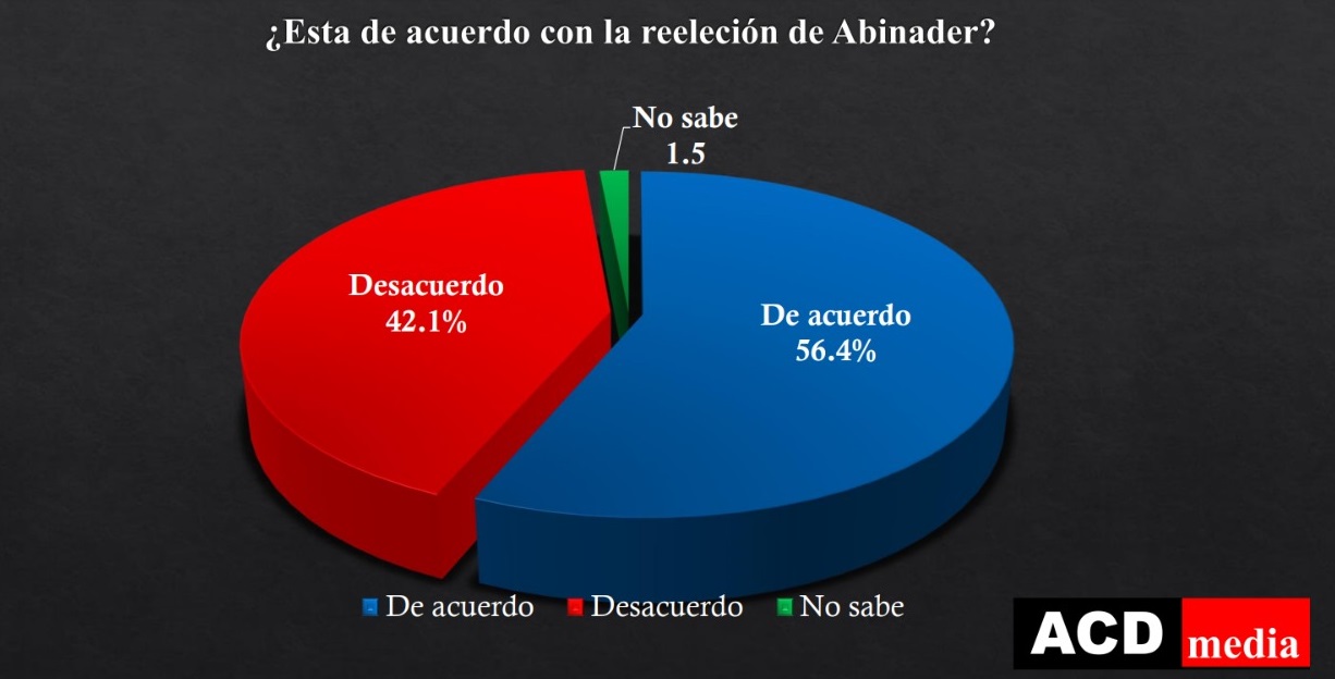 SANTO DOMIGO, RD. – Un 56 por ciento de los dominicanos se expresó a favor de una repostulación del presidente Luis Abinader para gobernar el próximo periodo constitucional 2024-2028, reflejan los resultados de la Segunda Encuesta Nacional de Opinión Pública del grupo de comunicaciones ACD Media.
