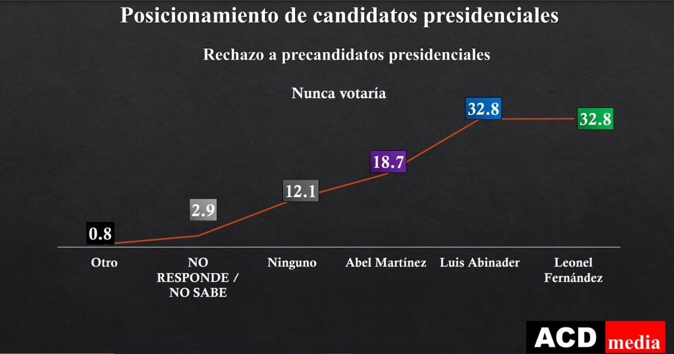 Ese dato aparece reflejado en los resultados de Segunda Encuesta Nacional de Opinión Pública del grupo de comunicaciones ACD Media. La ciudadanía, ante la pregunta de por quién nunca votaría, la respuesta fue que un 32.8% no lo haría por Luis Abinader y la misma cantidad porcentual tampoco endosaría a Leonel Fernández.
