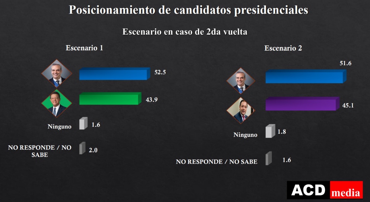 República Dominicana.-La encuesta evalúa un posible escenario de segunda vuelta, donde de acuerdo a los encuestados, ganaría el presidente Luis Abinader con un 52.5% sobre Leonel Fernández, que obtendría 43.9% y, en un segundo escenario también ganaría la reelección, con 51.6% sobre el peledeista Abel Martínez, que alcanzaría 45.1%.