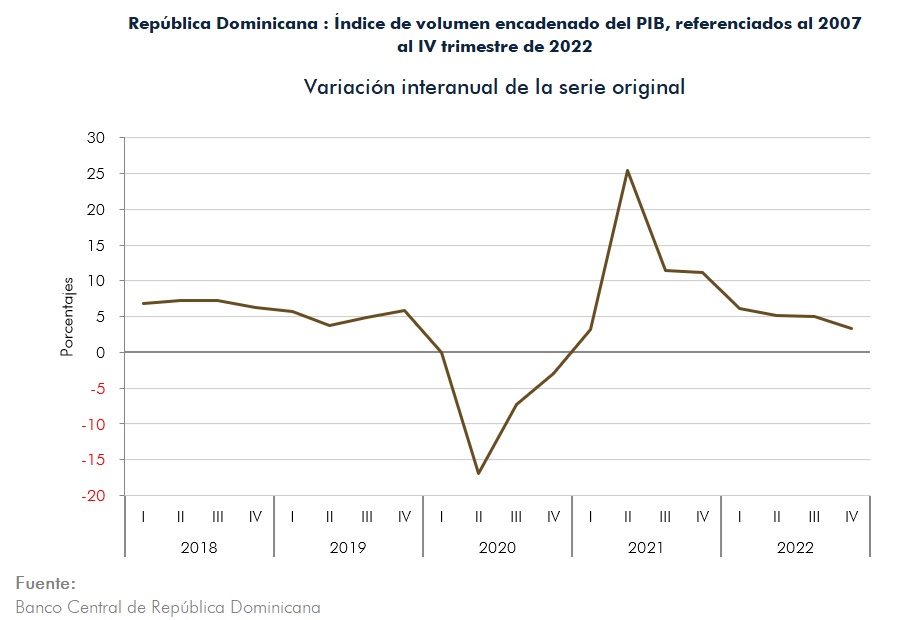 El Producto Interno Bruto real registró una variación interanual de 3.3% en el IV trimestre de 2022 al compararlo con el mismo trimestre del año anterior (variación interanual), resultado que es inferior al 11.1% registrado en el mismo trimestre de 2021.