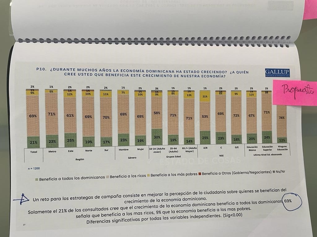 “Un reto para los estrategas de campaña consiste en mejorar la percepción de la ciudadanía sobre quienes se benefician del crecimiento de la economía dominicana. Solamente el 21% de los consultados cree que el crecimiento de la economía dominicana beneficia a todos los dominicanos 69% señala que beneficia a los más ricos, 9% que la economía beneficia a los más pobres. Diferencias negativas por todas las variables independientes”, se lee al pie de la referida página, cuyo encabezado pregunta ¿Durante muchos años la economía dominicana ha estado creciendo? ¿A quién cree usted que beneficia este crecimiento de nuestra economía?.
