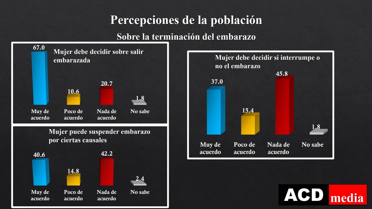 En primera parte de la Cuarta Encuesta Nacional de Opinión Política, 20.7% está en desacuerdo con que la mujer decida sobre si salir embarazada, y el 37.0% se mostró de acuerdo en que la mujer decida si aborta o no.