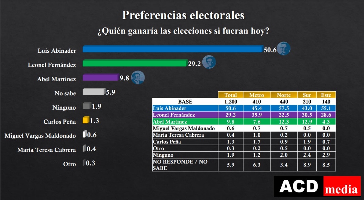 Ante una pregunta a los encuestados de que por quién votaría para Presidente, el 50.5 favorece al mandatario; un 29.8% a Leonel Fernández; 18.6 por Abel Martínez; 1,3 por Carlos Peña y el 1.0 por Miguel Vargas Maldonado.