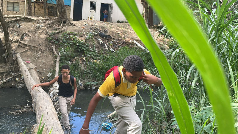 Santiago RD .- Los estudiantes del sector Miraflores II en Santiago, deben arriesgarse a cruzar hacia el otro lado del barrio a través de una pasarela improvisada construida con palos y troncos de árboles, que les ayudan a no caer a las pestilentes aguas del arroyo Gurabo.