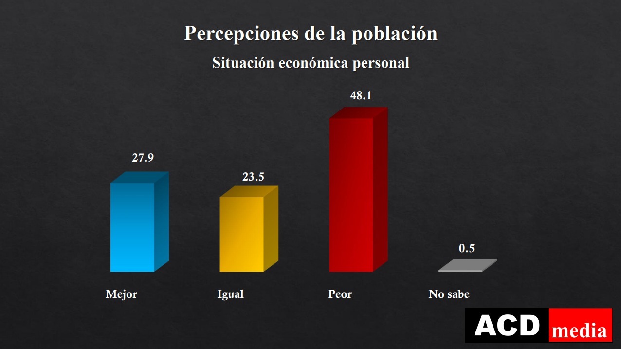 REPUBLICA DOMINICANA.- Para el 48.1 por ciento de la población dominicana, la situación económica personal está peor que antes, mientras que el 27.9 indica que está mejor que hace tiempo, según destaca la primera entrega de la Cuarta Encuesta Nacional de Opinión Pública, del grupo ACDMEDIA, publicada este martes.