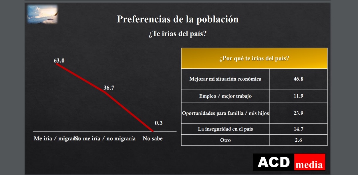 Entre los que plantearon irse del país, un 46.8% dice que lo haría por mejor situación; el 23.9% en busca de mejores oportunidades familiares; 11.9% por un mejor empleo o trabajo y el 14,7% por el problema de la inseguridad ciudadana.