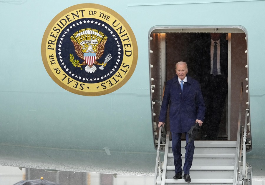 Biden fue el primero en bajar del avión con un paraguas de color negro que llevaba cerrado pese a la lluvia. Le siguieron varios miembros de la comitiva estadounidense, incluido el secretario de Estado, Antony Blinken.