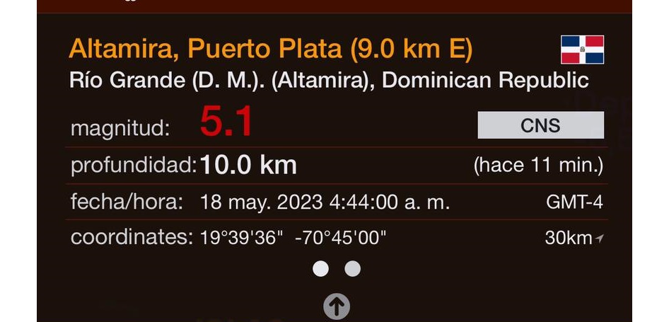 El temblor ocurrió a las 4:35 de la madrugada en la provincia de Puerto Plata, a 17 kilómetros de la región de Altamira con una profundidad de 10.2 kilómetros.